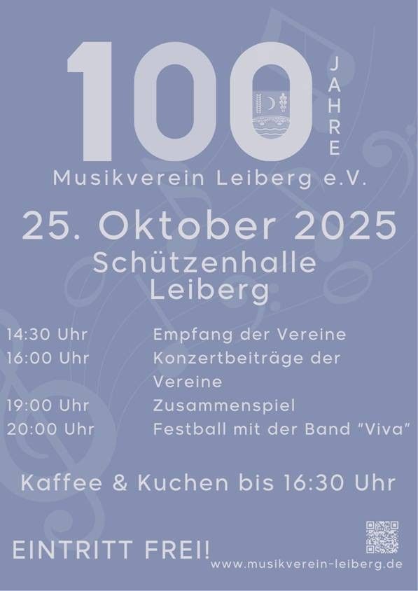 Anlässlich seines 100-jährigen Bestehen feiert der Musikverein Leiberg sein Jubiläum mit Konzertbeiträgen der befreundeten Musikvereinen, Tambourcorps und Spielmannszügen bei kalten Getränken sowie Kaffee und Kuchen und einem anschließenden Festball mit der Band "Viva".